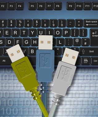 Newer keyboards and mice and many other peripheral devices usually attach using USB connections. (See the image below.) A USB cable has a flat end and newer computers have many USB ports on them – sometimes on both the front and the back. There are also storage devices that plug into USB ports as do wireless keyboards and mice.